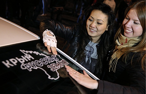 Фото: Россия. Москва. 17 марта 2015года. Участницы автопробега "Крым вернулся в родную гавань" на Воробьевых горах в честь годовщины референдума о присоединении Крыма к России приклеивают наклейку на автомобиль. Артем Коротаев/ТАСС