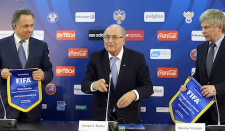 Фото: Россия. Санкт-Петербург. 16 января. Министр спорта РФ Виталий Мутко, президент Международной федерации футбола (ФИФА) Йозеф Блаттер и президент Российского футбольного союза (РФС) Николай Толстых (слева направо) на пресс-конференции, посвященной кубку Содружества-2015. Руслан Шамуков/ТАСС