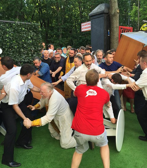 Не знаю, как оценят эту историю правоохранительные органы. Никак, скорее всего. Но в описании самого о. Димитрия это выглядело так: были недовольны шумом, пошли разбираться, а дальше «вынуждены были прорываться сквозь кордон, но никого в лицо не били, руки не ломали». Прорывались они на мероприятие, куда их не звали и куда билетов они не покупали. Прорвались аж на сцену, применили силу к ведущему и организованно удалились.