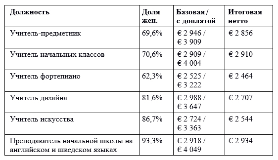 Во-вторых, профессия учителя в Суоми является гарантией нормального заработка. Зарплата обычного школьного учителя хоть и не является пределом мечтаний для тех, кто работает в сфере бизнеса, но представляет собой достаточно внушительную сумму, на которую преподаватель, даже живя один, может спокойно купить собственное жилье, машину, а также регулярно путешествовать за границу. Для этого ему не обязательно работать без продыху: учителя проводят в школе только 4 часа в день (не считая времени, уделяемого профессиональному совершенствованию). Зарплата финского школьного учителя состоит из постоянной части, определяемой позицией (учитель младших классов, учитель-предметник, учитель в старшей школе и т.д.), и персональной части, зависящей от опыта, личностных профессиональных качеств, уровня образования.